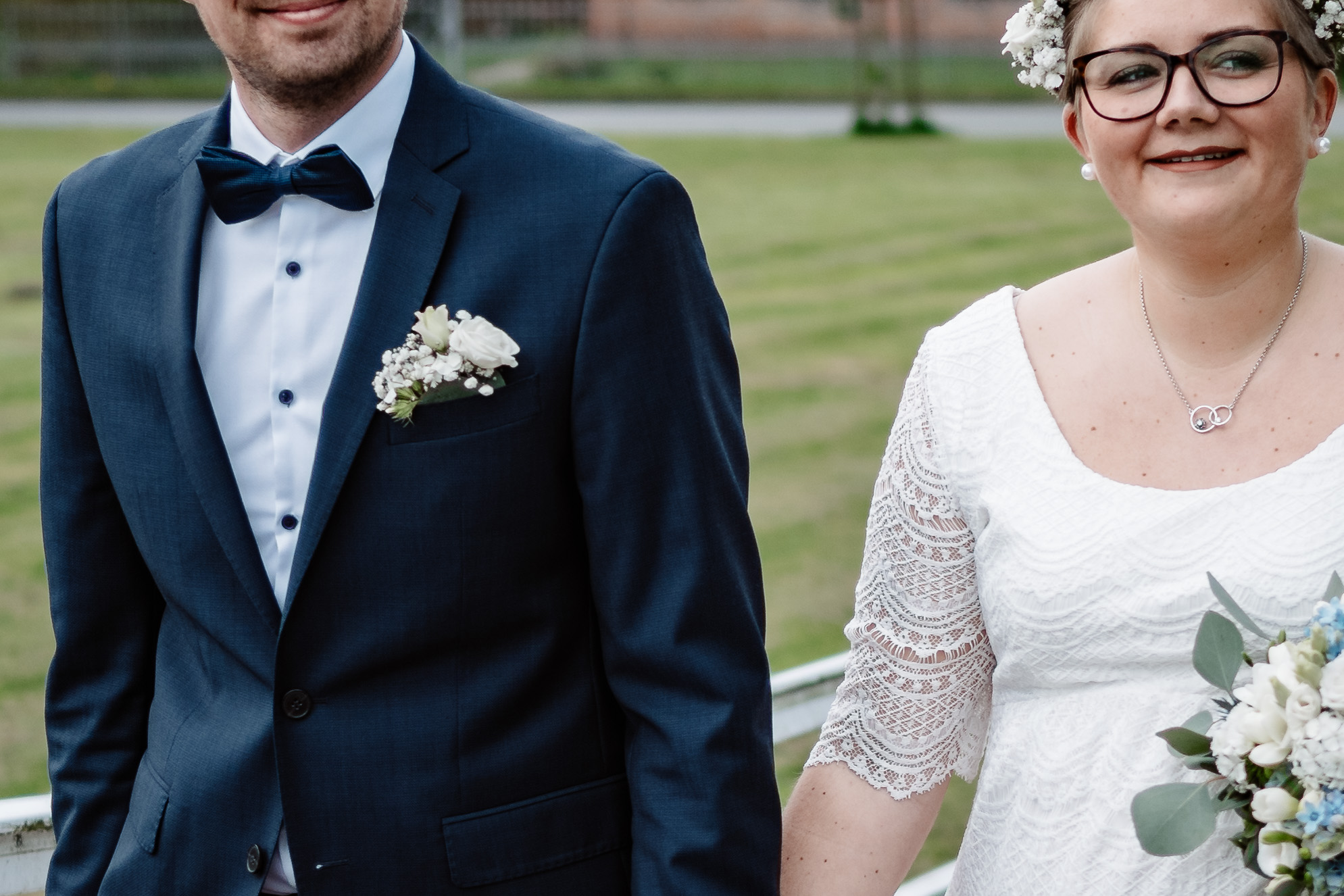 Da der Bräutigam schon leicht aus der Fokusebene tritt, werden zwischen dem weißen Hemd und dunkel blauem Sakko lila-blaue Farbsäume sichtbar. Auch das weiße Geländer ist von dunklem Schmutz überzogen, dessen Kontrast grüne Farbsäume hervorruft.